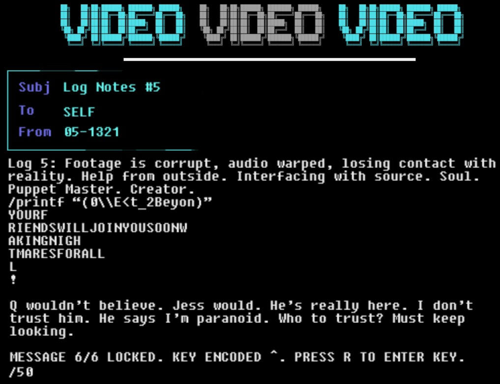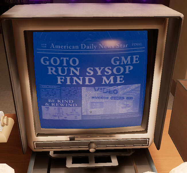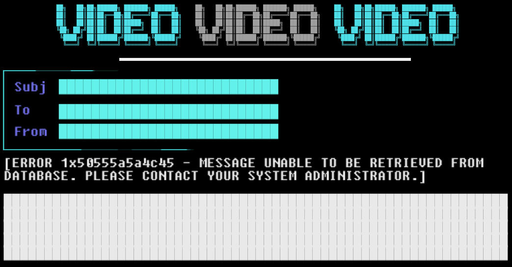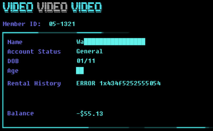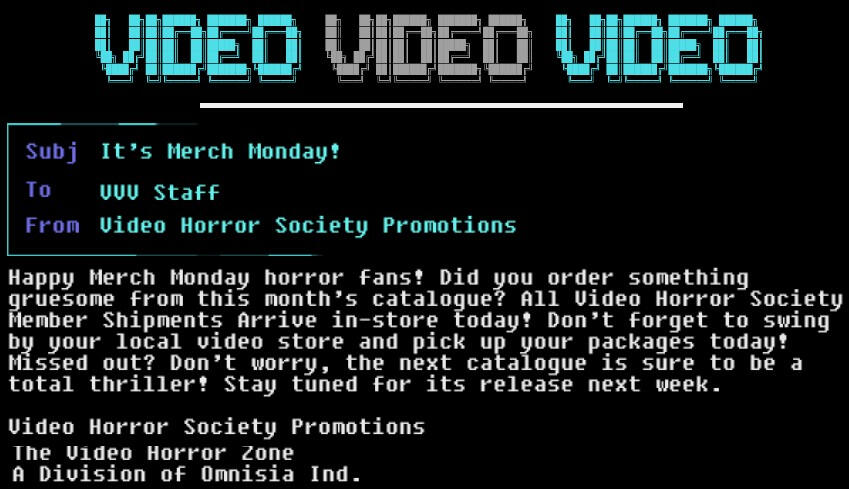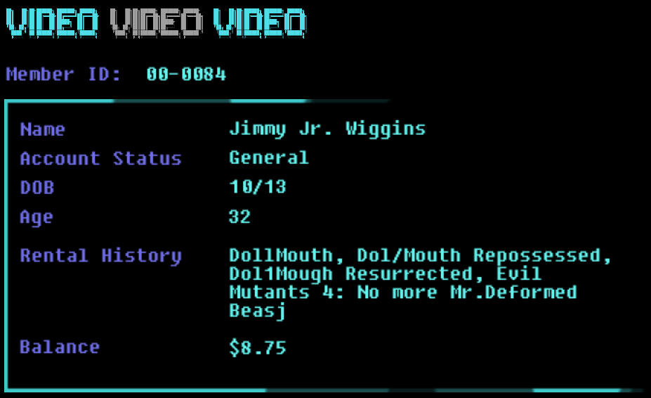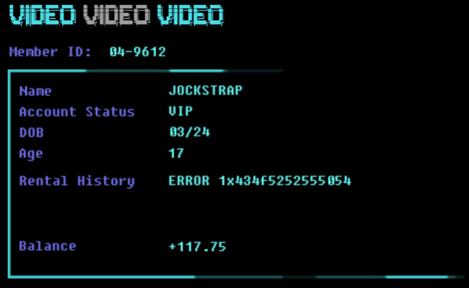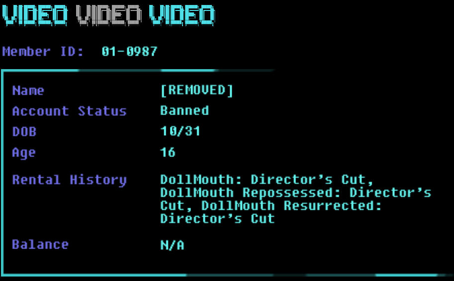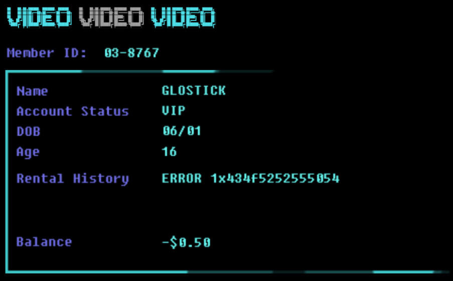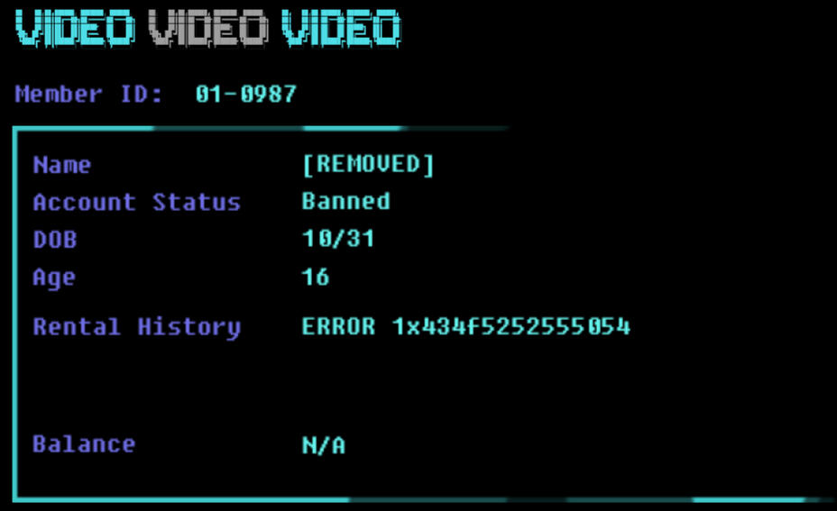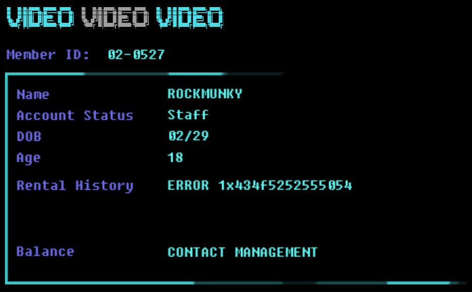 From here, we were only able to access the (M) Messages and (N) Notes menus, with any other selection leading us to a page stating:"ERROR: DATABASE INACCESSIBLE. PLEASE CONTACT A SYSTEM ADMINISTRATOR."In the Notes menu, we saw several lore tidbits from characters with suggestions, complaints, and general notes. These notes were as follows:-------------------------------------------------1. More documentaries please.2. ALL Staff should wear the new “Be Kind. Rewind.” badges I made (with sparkles!) and give them to members who actually do their part to promote Video Horror Society and help others.3. CLEAN THE BATHROOM. GRODY TO THE MAX.4. FREE POPCORN FRIDAYS5. Bring your Cat to Work Day6. GO EFF YOURSELF LEO.7. Minimum age for R-rated rentals should be 128. More Video Horror Society Members Only Movie Nights in the back! There is nothing else to do in this town and I gotta say it's the perfect make out spot.9. Two for Tuesday rentals should last 2 weeks not one.10. BRETT <3 GLORIA. TLA!11. Idea for the store! (Author: F) - I would like to suggest a Suggestion Box for the counter to facilitate better customer service. I would be happy to make it!12. ERROR - [ERROR 1x4d454d4641554c54 - UNABLE TO RETRIEVE FROM DATABASE. PLEASE CONTACT YOUR SYSTEM ADMINISTRATOR.](+Various error message notes with error codes translating from binary to text to read "MEMFAULT")***We could also access the Messages menu, which had several emails and error messages within. The error emails could have their error codes run through a binary to text translator, once the 1x was removed from each error code, to be translated into words/messages.-------------------------------------------------