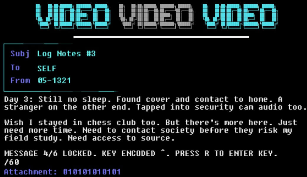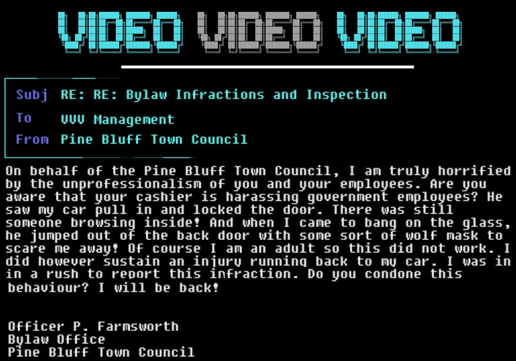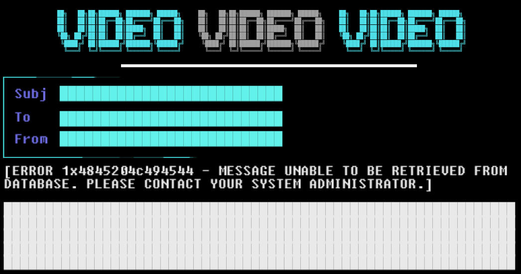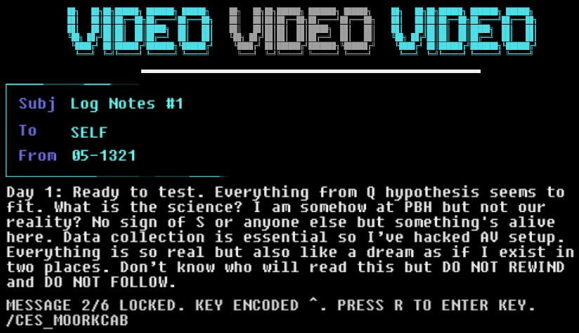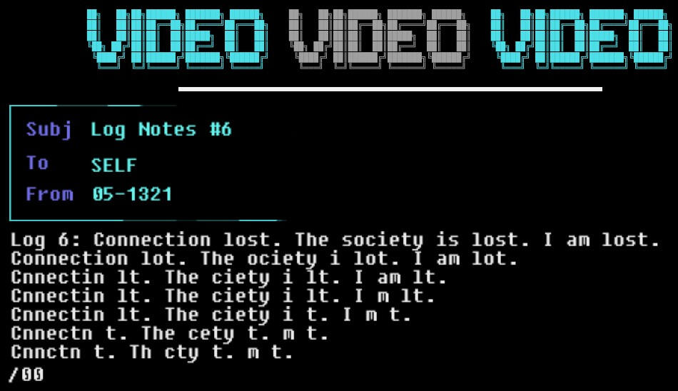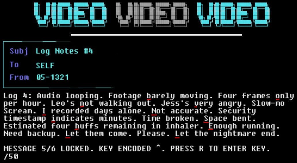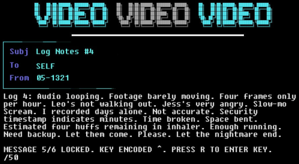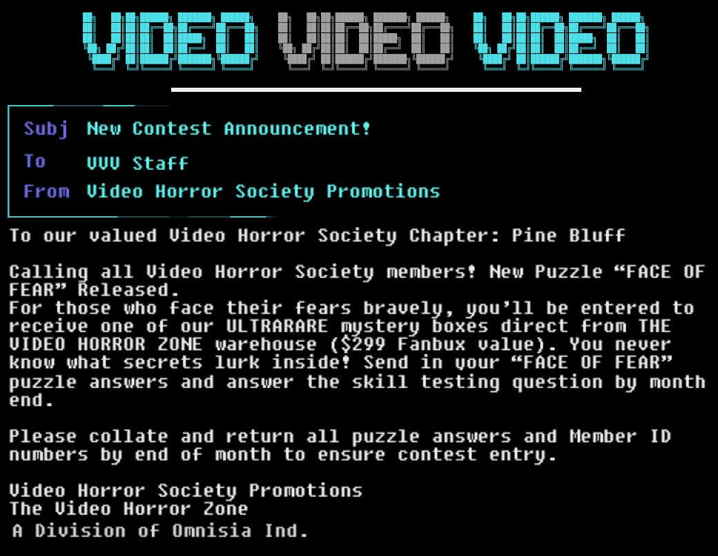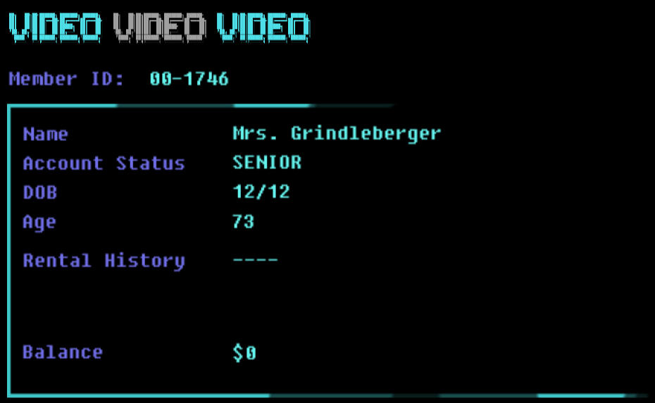 From here, we were only able to access the (M) Messages and (N) Notes menus, with any other selection leading us to a page stating:"ERROR: DATABASE INACCESSIBLE. PLEASE CONTACT A SYSTEM ADMINISTRATOR."In the Notes menu, we saw several lore tidbits from characters with suggestions, complaints, and general notes. These notes were as follows:-------------------------------------------------1. More documentaries please.2. ALL Staff should wear the new “Be Kind. Rewind.” badges I made (with sparkles!) and give them to members who actually do their part to promote Video Horror Society and help others.3. CLEAN THE BATHROOM. GRODY TO THE MAX.4. FREE POPCORN FRIDAYS5. Bring your Cat to Work Day6. GO EFF YOURSELF LEO.7. Minimum age for R-rated rentals should be 128. More Video Horror Society Members Only Movie Nights in the back! There is nothing else to do in this town and I gotta say it's the perfect make out spot.9. Two for Tuesday rentals should last 2 weeks not one.10. BRETT <3 GLORIA. TLA!11. Idea for the store! (Author: F) - I would like to suggest a Suggestion Box for the counter to facilitate better customer service. I would be happy to make it!12. ERROR - [ERROR 1x4d454d4641554c54 - UNABLE TO RETRIEVE FROM DATABASE. PLEASE CONTACT YOUR SYSTEM ADMINISTRATOR.](+Various error message notes with error codes translating from binary to text to read "MEMFAULT")***We could also access the Messages menu, which had several emails and error messages within. The error emails could have their error codes run through a binary to text translator, once the 1x was removed from each error code, to be translated into words/messages.-------------------------------------------------