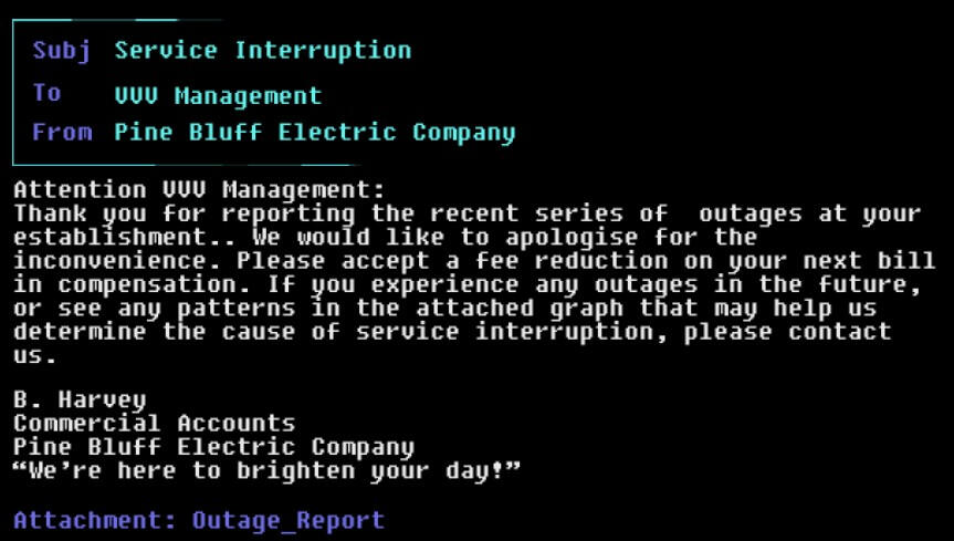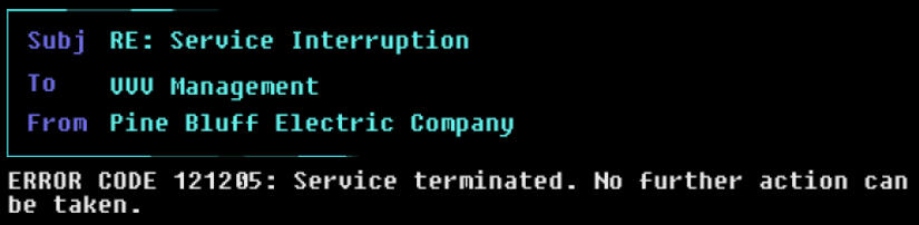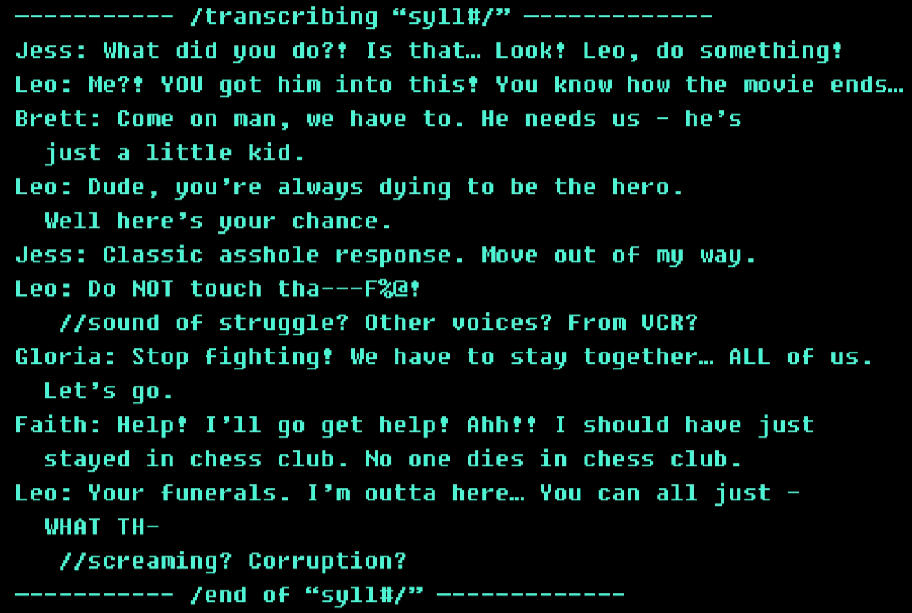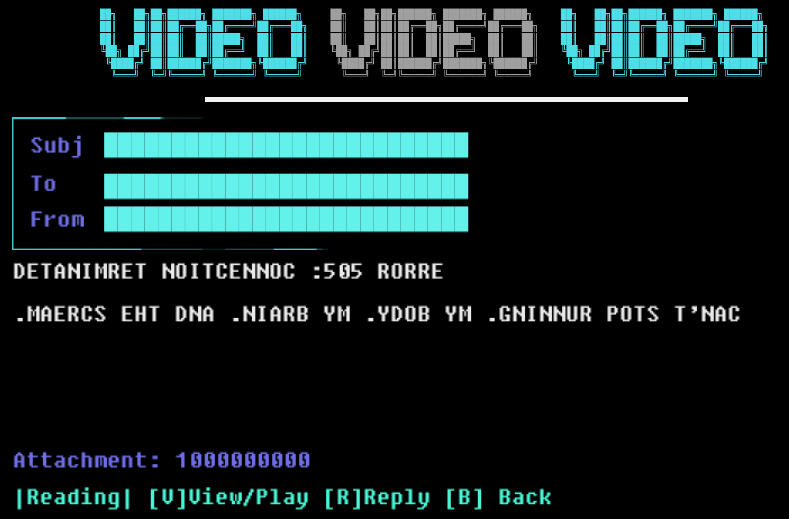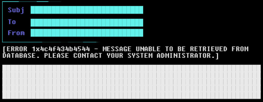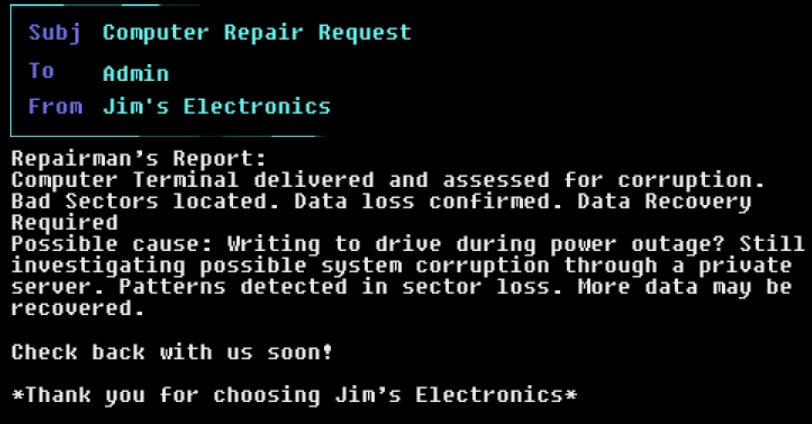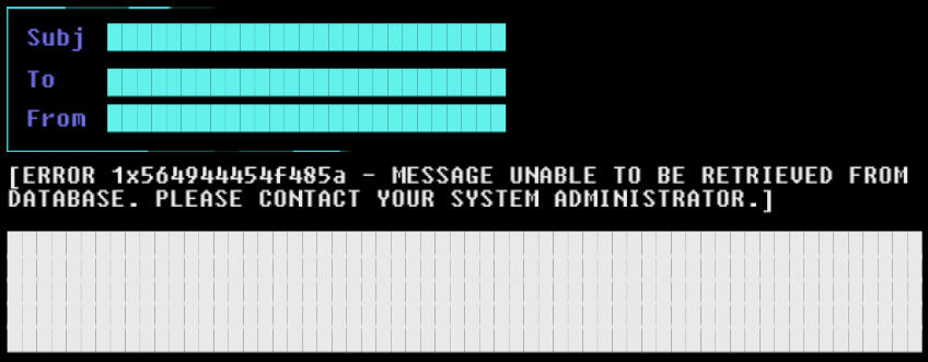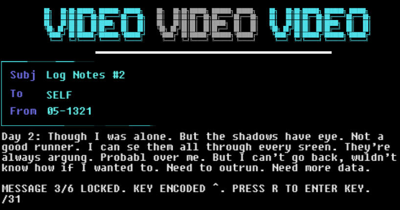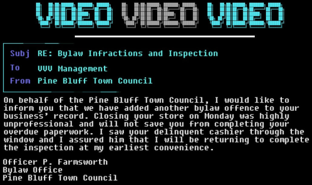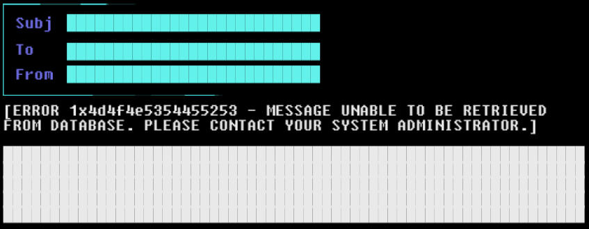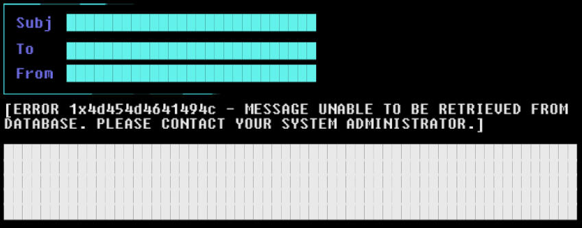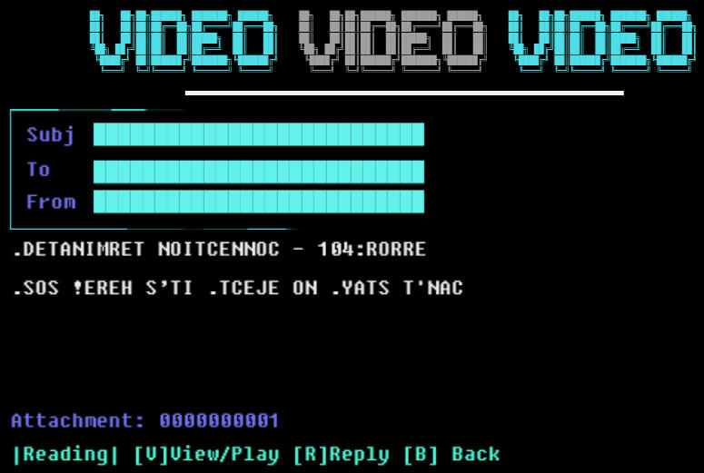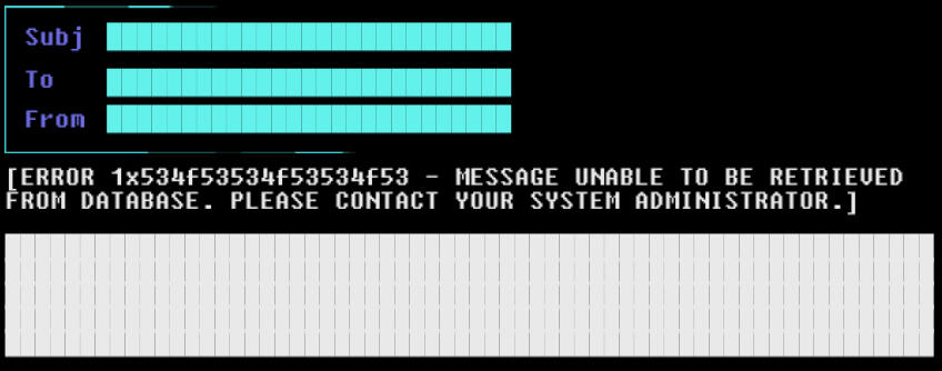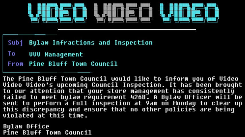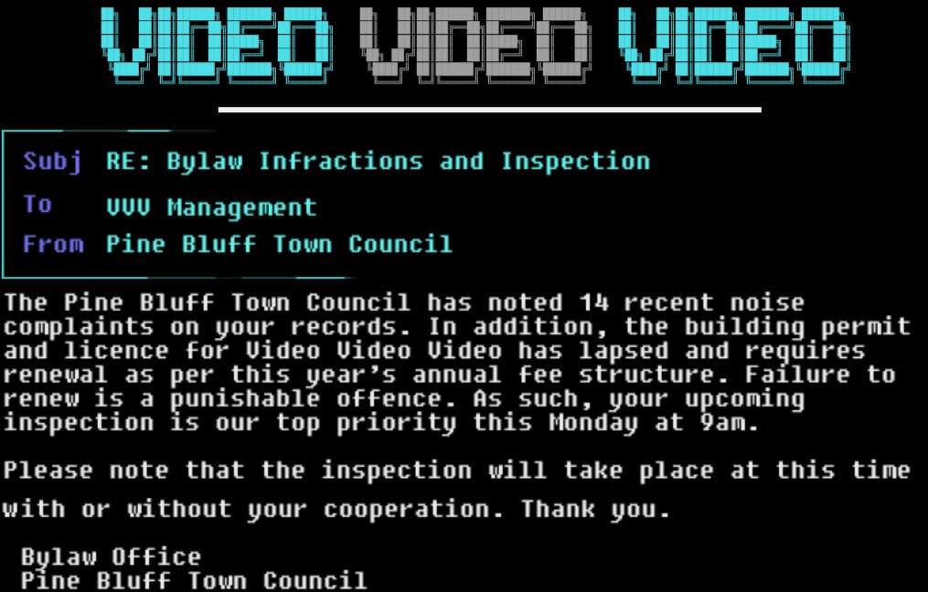 From here, we were only able to access the (M) Messages and (N) Notes menus, with any other selection leading us to a page stating:"ERROR: DATABASE INACCESSIBLE. PLEASE CONTACT A SYSTEM ADMINISTRATOR."In the Notes menu, we saw several lore tidbits from characters with suggestions, complaints, and general notes. These notes were as follows:-------------------------------------------------1. More documentaries please.2. ALL Staff should wear the new “Be Kind. Rewind.” badges I made (with sparkles!) and give them to members who actually do their part to promote Video Horror Society and help others.3. CLEAN THE BATHROOM. GRODY TO THE MAX.4. FREE POPCORN FRIDAYS5. Bring your Cat to Work Day6. GO EFF YOURSELF LEO.7. Minimum age for R-rated rentals should be 128. More Video Horror Society Members Only Movie Nights in the back! There is nothing else to do in this town and I gotta say it's the perfect make out spot.9. Two for Tuesday rentals should last 2 weeks not one.10. BRETT <3 GLORIA. TLA!11. Idea for the store! (Author: F) - I would like to suggest a Suggestion Box for the counter to facilitate better customer service. I would be happy to make it!12. ERROR - [ERROR 1x4d454d4641554c54 - UNABLE TO RETRIEVE FROM DATABASE. PLEASE CONTACT YOUR SYSTEM ADMINISTRATOR.](+Various error message notes with error codes translating from binary to text to read "MEMFAULT")***We could also access the Messages menu, which had several emails and error messages within. The error emails could have their error codes run through a binary to text translator, once the 1x was removed from each error code, to be translated into words/messages.-------------------------------------------------