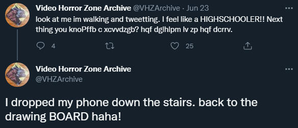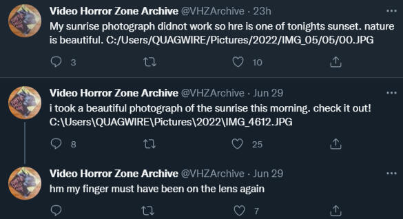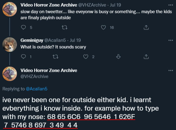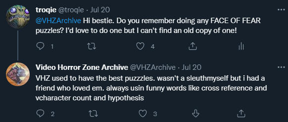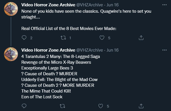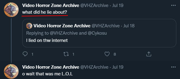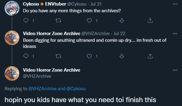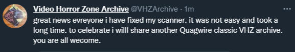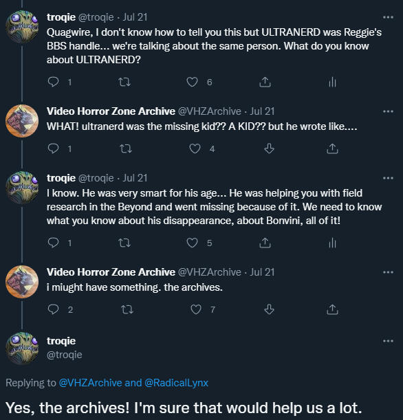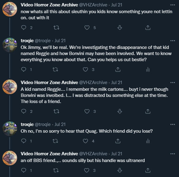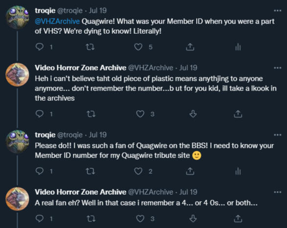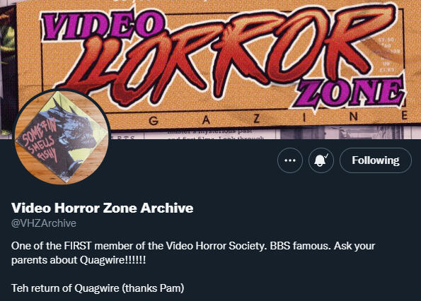 On the same day that we received the updates on the SYSOP site, it was discovered that there was a Twitter account interacting with the official VHS Twitter account that appeared to be a character from the game who was now an old man in the future running a Video Horror Zone Magazine archive Twitter account and called themselves Quagwire claiming to be one of the first members of the Video Horror Society.