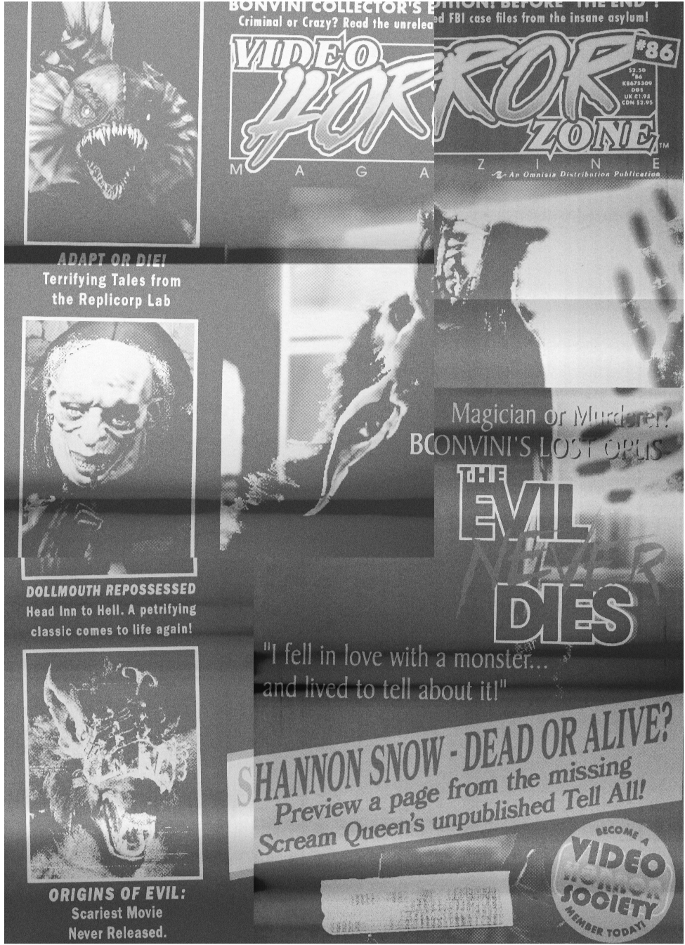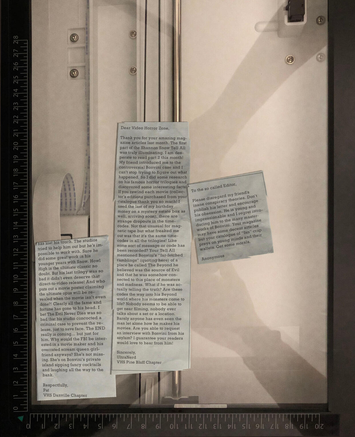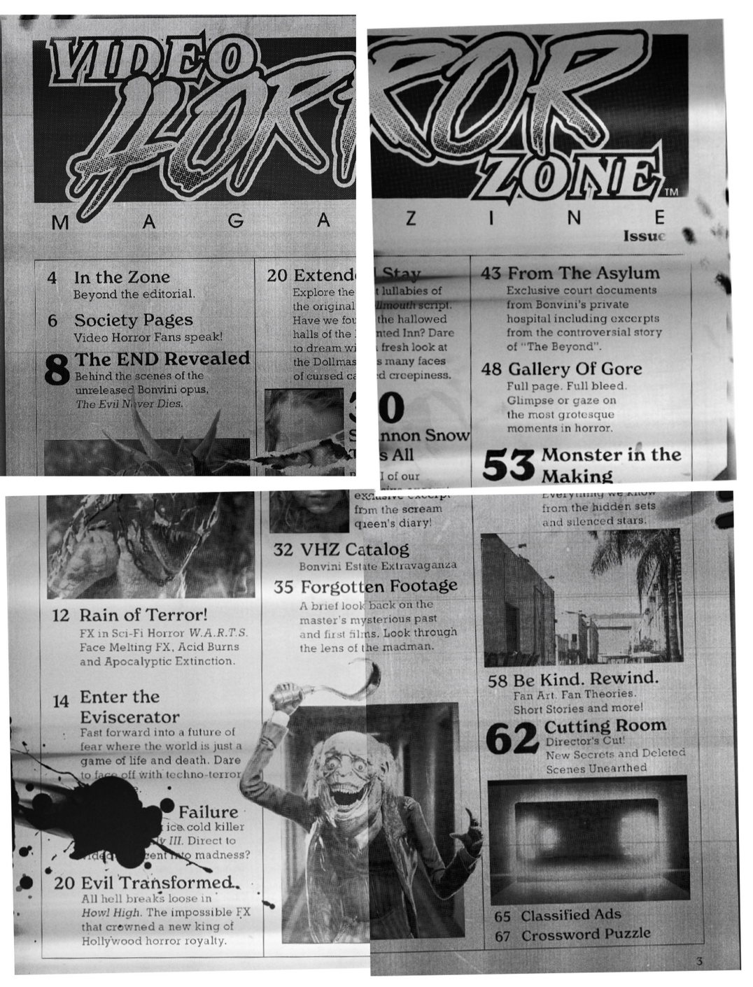 In this image, several lore tidbits were discovered:BONVINI COLLECTOR'S EDITION: BEFORE THE END! Criminal or Crazy? Read the unreleased FBI case files from the insane asylum.Magician or Murderer? BONVINI'S LOST OPUS. THE EVIL NEVER DIES."I fell in love with a monster... and lived to tell about it!"SHANNON SNOW - DEAD OR ALIVE? Preview a page from the missing Scream Queen's unpublished Tell All!