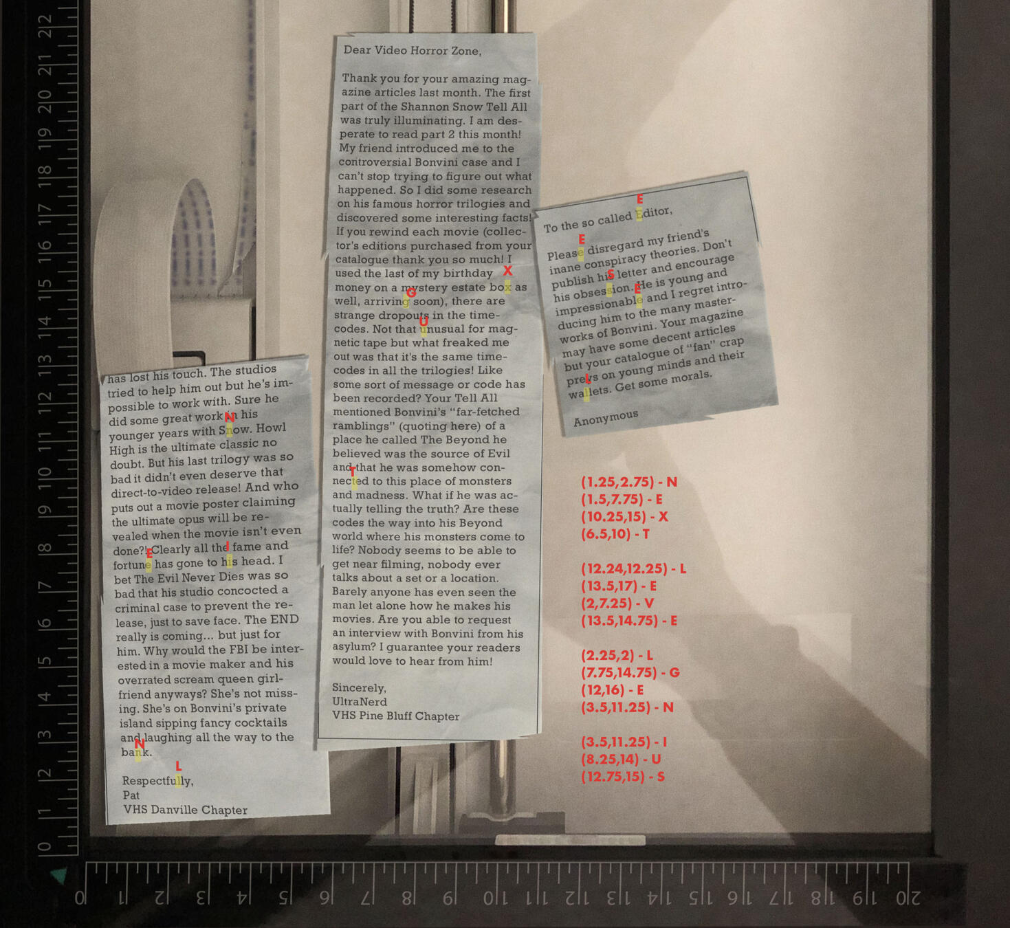 After a day of scratching our heads, one community member finally realized that the plot point clues could be used in conjunction with the photo of the clippings that Quagwire provided us from the archives, which included an X and Y graph for us to follow in the form of measurements on his cutting machine. Using this information, they lined up the points in the 505 Terminus movie with the clippings in the photo as such: