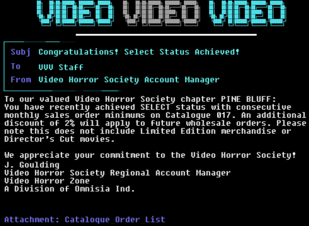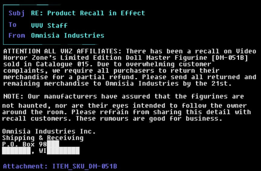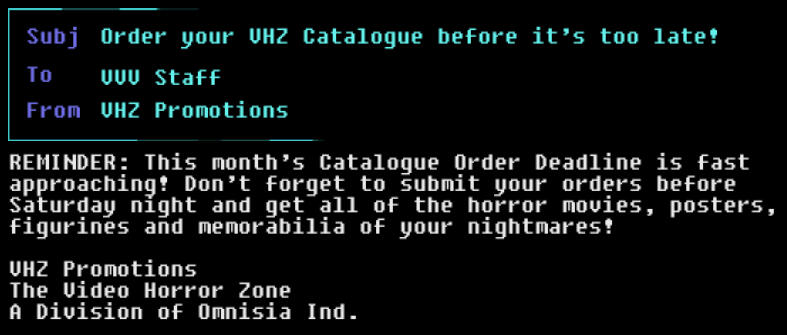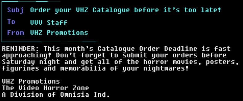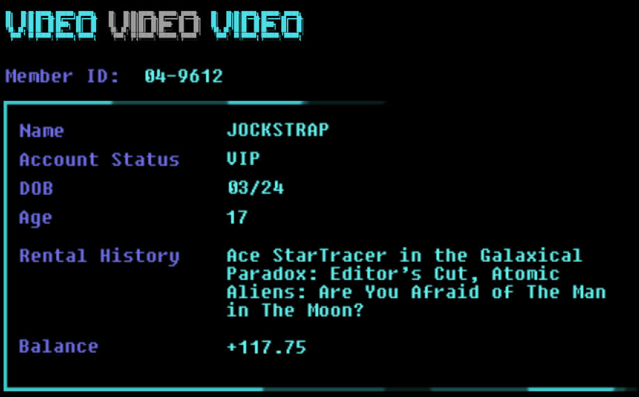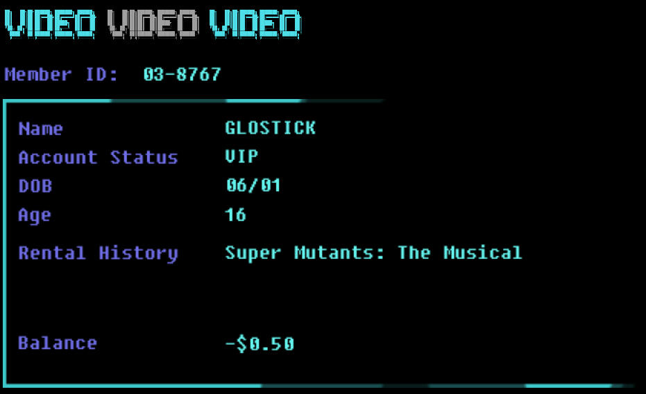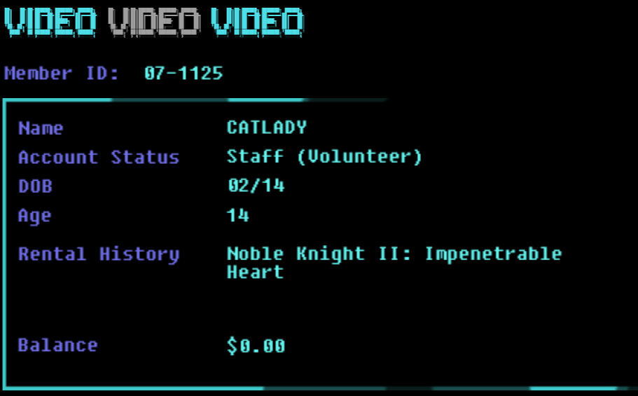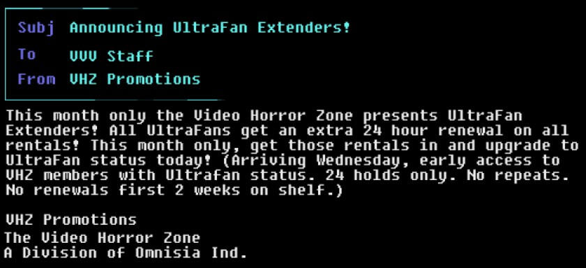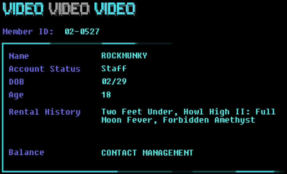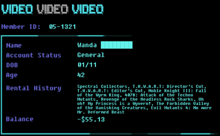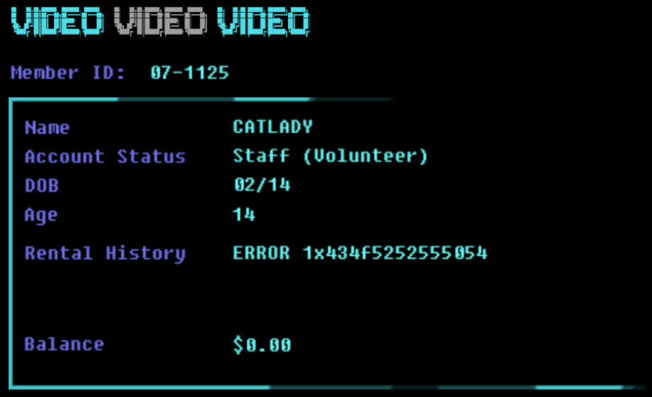 With this update we were also treated to some new emails entries to the notes menu, which went as follows:-------------------------------------------------1. Since the Suggestion Box I so kindly crafted went mysteriously missing last night (update: found burned remains in dumpster out back), I have entered all requests into the VVV computer.2. WHY - FAITH I WAS IN THE MIDDLE OF HOWL HIGH! I WAS GONE FOR 5 MINUTES!3. Backroom Desk - Stop shelving the tapes in the backroom. I’m using them.4. Customer Complaint 20 (Account 051321) - Parents concerned about their son’s access to account. Fraudulent charges.5. Customer Feedback 1 - To the nice redheaded girl who helped us last Friday when there was nobody working the desk (even though the manager was technically present at said desk). She deserves a promotion.6. Cats - Not that I care, but no cats allowed on volunteer shifts. It’s weird.7. RATS - There’s some rats in the store. I keep catching glimpses of them scurrying around in the back. They keep gnawing at pipes, causing leaks and stuff. Shady little jerks.-------------------------------------------------The community was quick to realize that the 4th new note, signed with the author "Account 051321" was likely a Member ID number and input this into the VHZ Membership Database to unlock this: